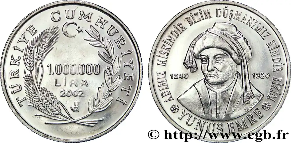 TURQUIE 1.000.000 Lira le poète turc Yunus Emre (1240-1320) 2002 fwo_555849 Monde Must-Have