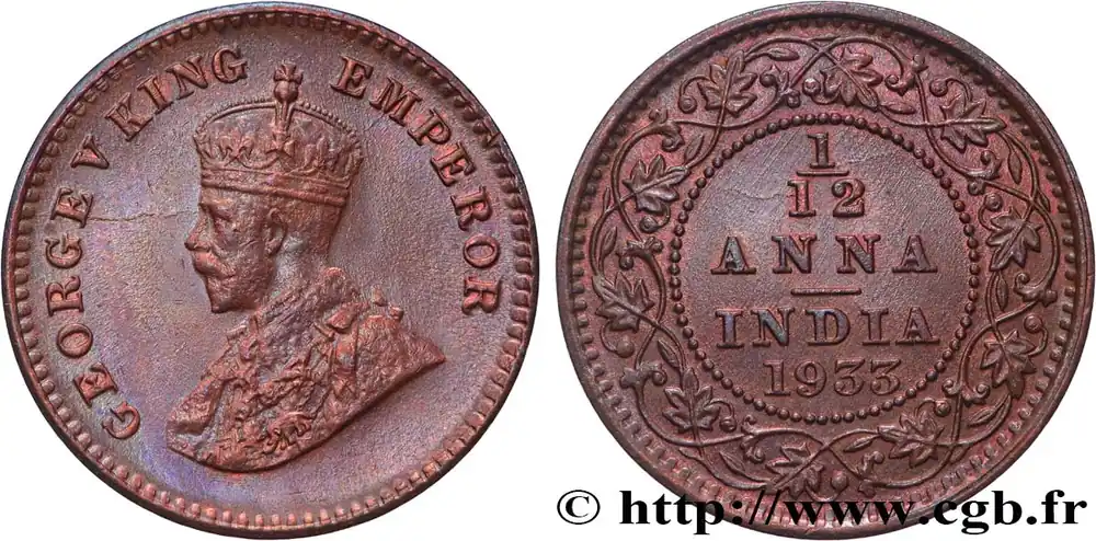 INDES BRITANNIQUES 1/12 Anna (1 Pie) Georges V 1933 Calcutta fwo_822147 Monde Gros Lot
