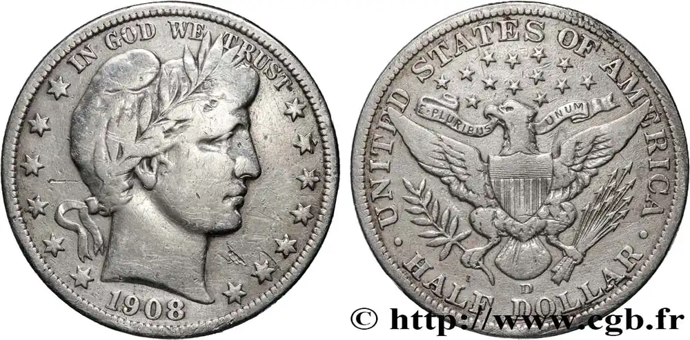 ÉTATS-UNIS D’AMÉRIQUE 1/2 Dollar Barber 1908 Denver fwo_839206 Monde Meilleure Vente