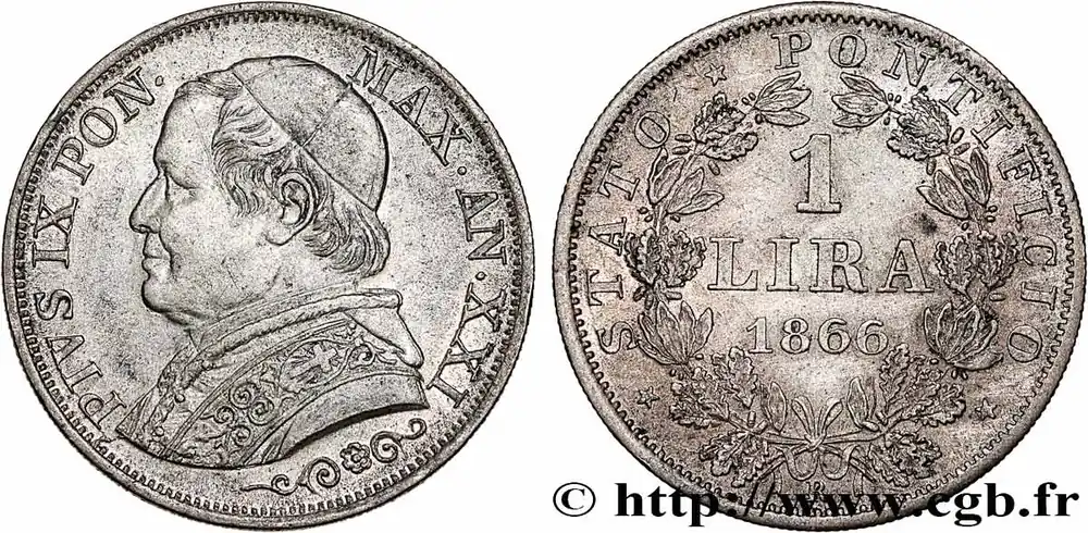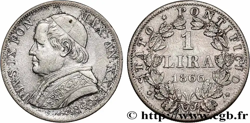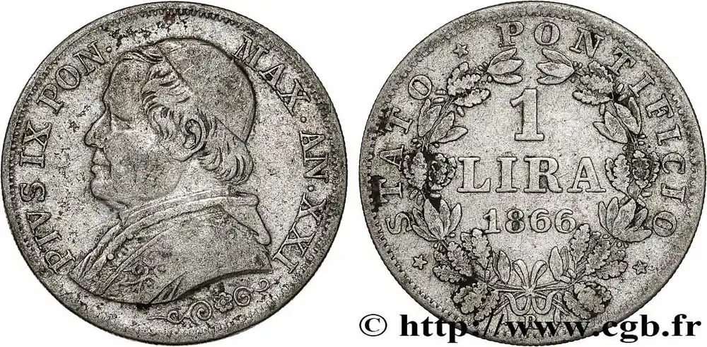 VATICAN ET ÉTATS PONTIFICAUX 1 Lire Pie IX type grand buste an XXI 1866 Rome fwo_737225 Monde Édition Limitée