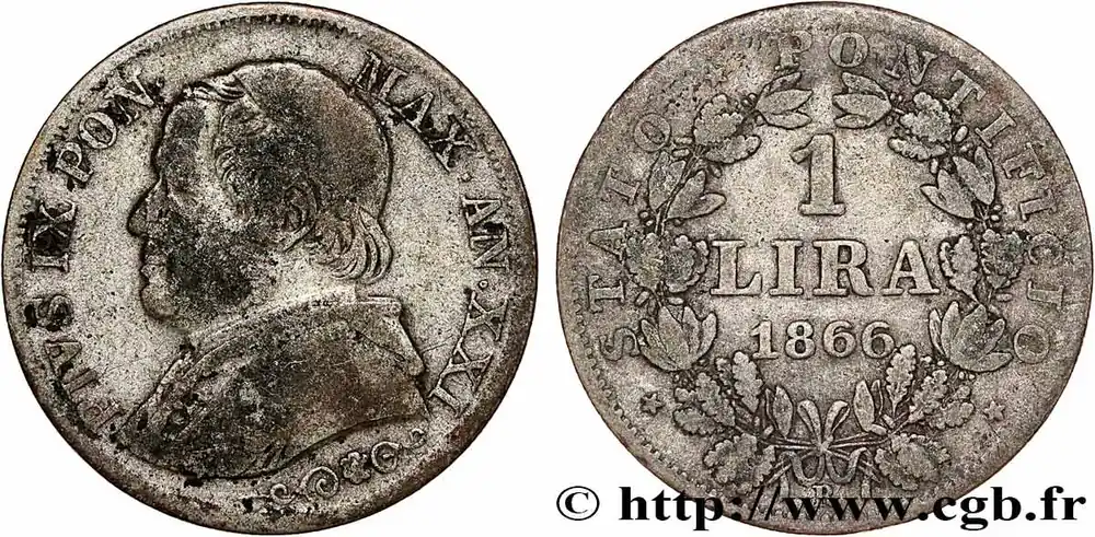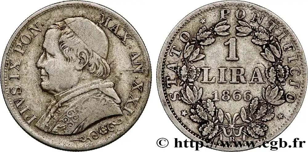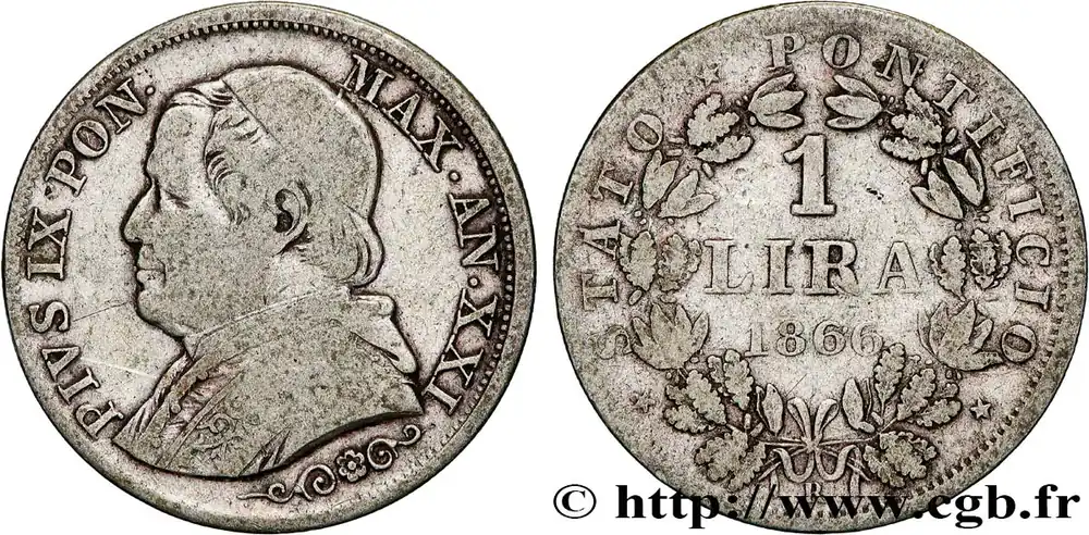 VATICAN ET ÉTATS PONTIFICAUX 1 Lire Pie IX type grand buste an XXI 1866 Rome fwo_784642 Monde Artisanat