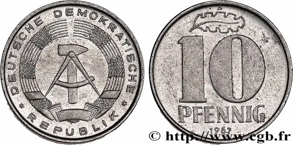 Certifié ALLEMAGNE RÉPUBLIQUE DÉMOCRATIQUE 10 Pfennig emblème de la RDA 1967 Berlin fwo_749026 Monde