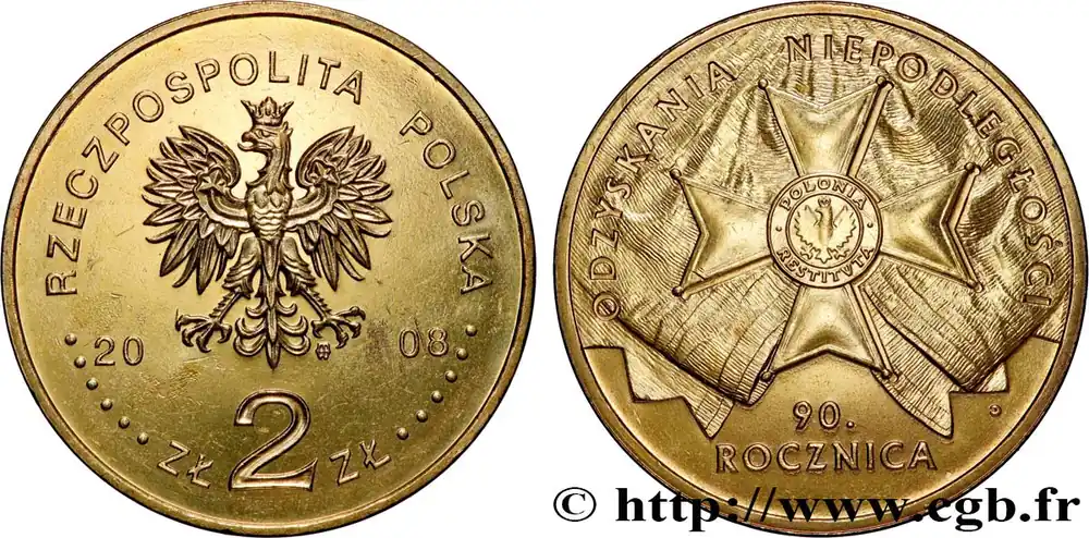 POLOGNE 2 Zlote 90e anniversaire du retour à l’indépendance 2008 Varsovie fwo_1001276 Monde Retour Gratuit