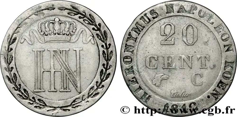 ALLEMAGNE – ROYAUME DE WESTPHALIE – JÉRÔME NAPOLÉON 20 Centimes 1812 Cassel fwo_853742 Monde Haute Qualité