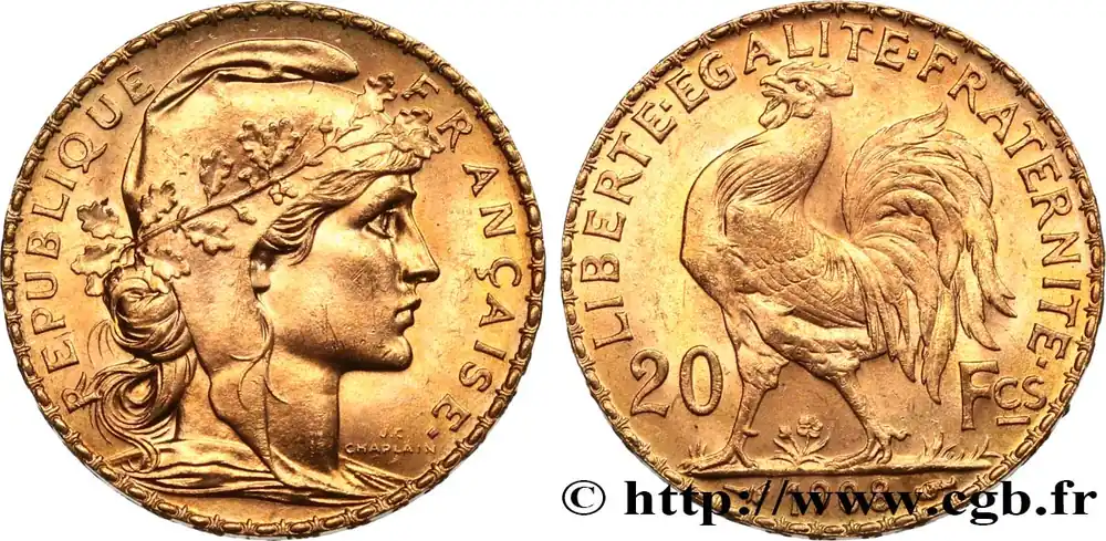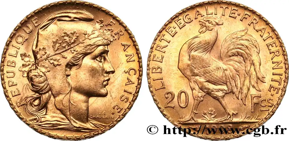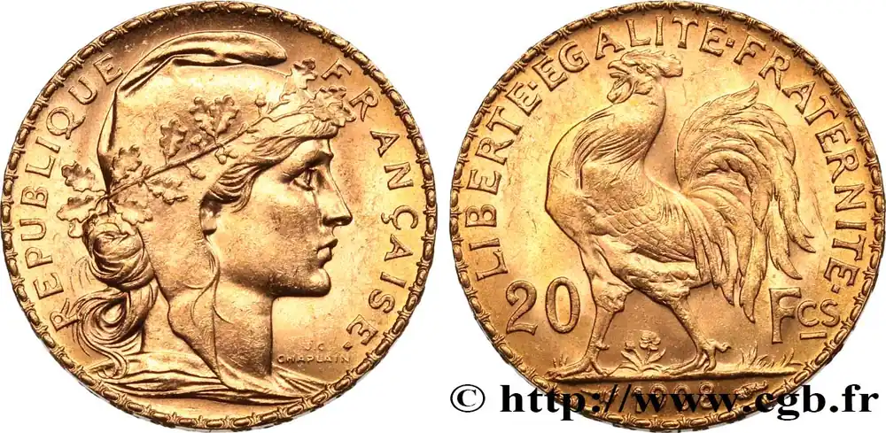 20 francs or Coq, Liberté Égalité Fraternité 1908 Paris F.535/2 fmd_585564 Modernes Seulement Aujourd’hui