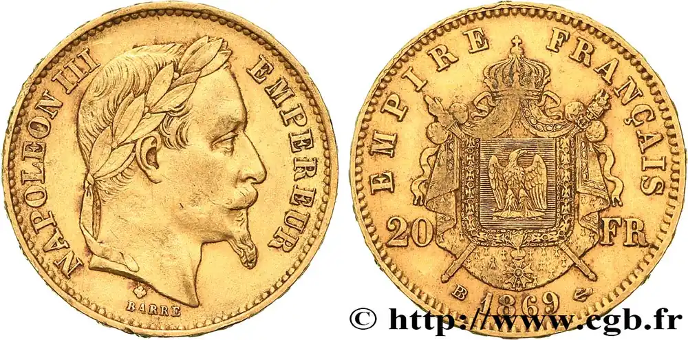 Marque 20 francs or Napoléon III, tête laurée, petit BB 1869 Strasbourg F.532/21 fmd_620695 Modernes