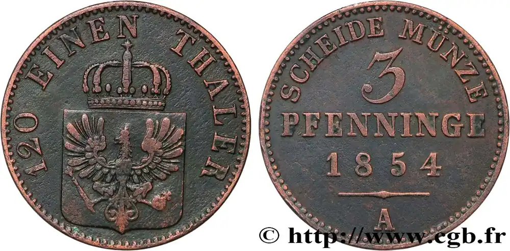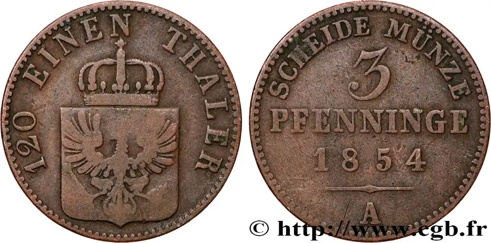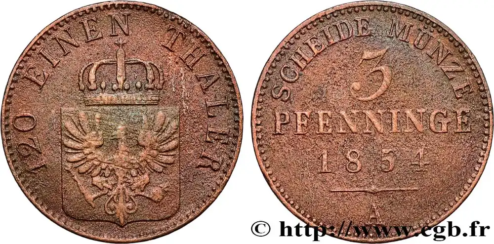 ALLEMAGNE – PRUSSE 3 Pfenninge Royaume de Prusse écu à l’aigle 1854 Berlin fwo_748212 Monde Vente Directe