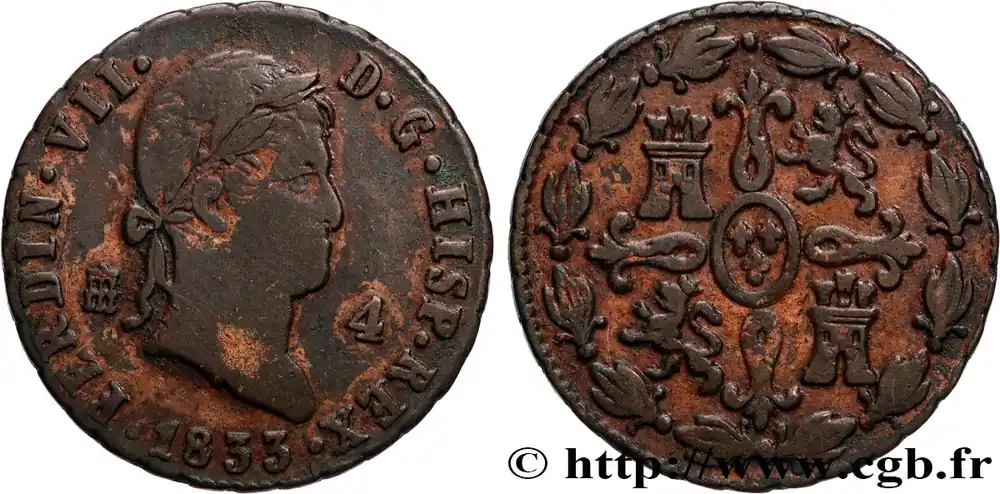 Livraison Gratuite ESPAGNE 4 Maravedis Ferdinand VII 1833 Ségovie fwo_898589 Monde