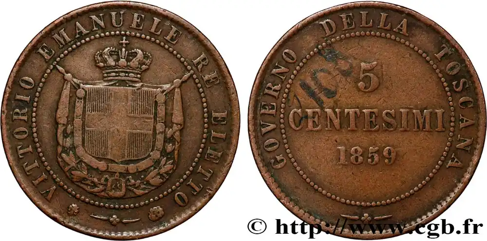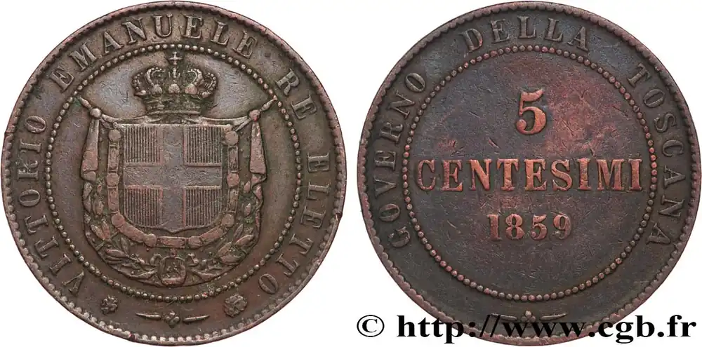 ITALIE – TOSCANE 5 Centesimi Gouvernement de la Toscane, Victor Emmanuel, armes de Savoie 1859 Birmingham fwo_896622 Monde Top Qualité