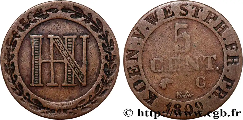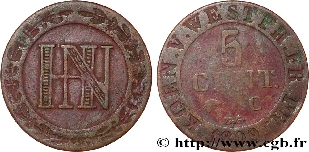 Original ALLEMAGNE – ROYAUME DE WESTPHALIE 5 Centimes monogramme de Jérôme Napoléon 1809 Cassel fwo_739731 Monde