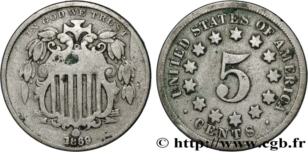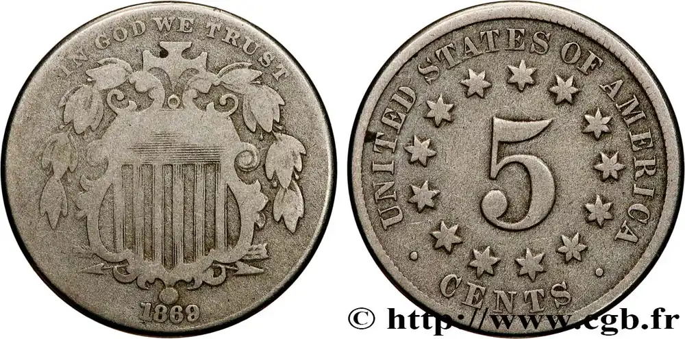ÉTATS-UNIS D’AMÉRIQUE 5 Cents bouclier variété sans rayons entre les étoiles 1869 Philadelphie fwo_834042 Monde Petit Prix