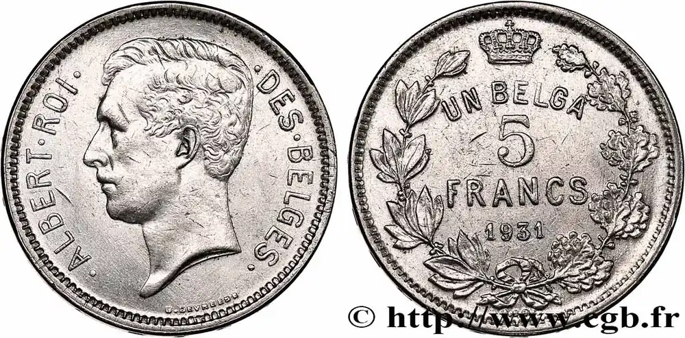 BELGIQUE 5 Francs – 1 Belga Albert Ier légende Française 1931 fwo_753545 Monde Exclusif