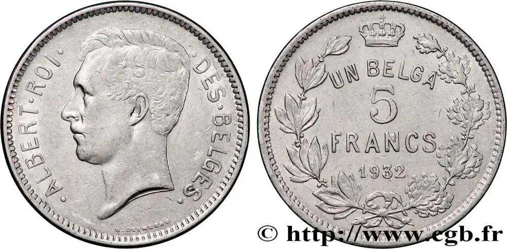 BELGIQUE 5 Francs – 1 Belga Albert Ier légende Française 1932 fwo_852431 Monde Super Prix