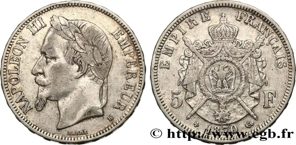 Prix Choc 5 francs Napoléon III, tête laurée 1870 Strasbourg F.331/17 fmd_599324 Modernes