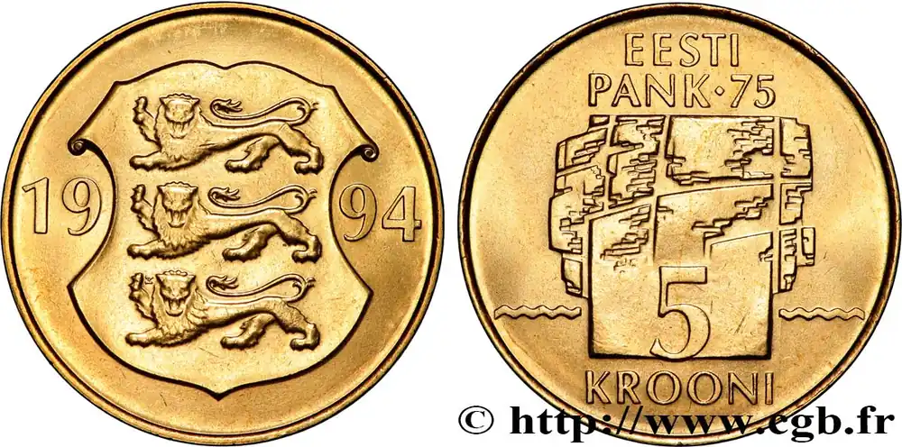 ESTONIE 5 Krooni 75e anniversaire de la Banque Nationale 1994 Tallinn fwo_756805 Monde Seulement Aujourd’hui