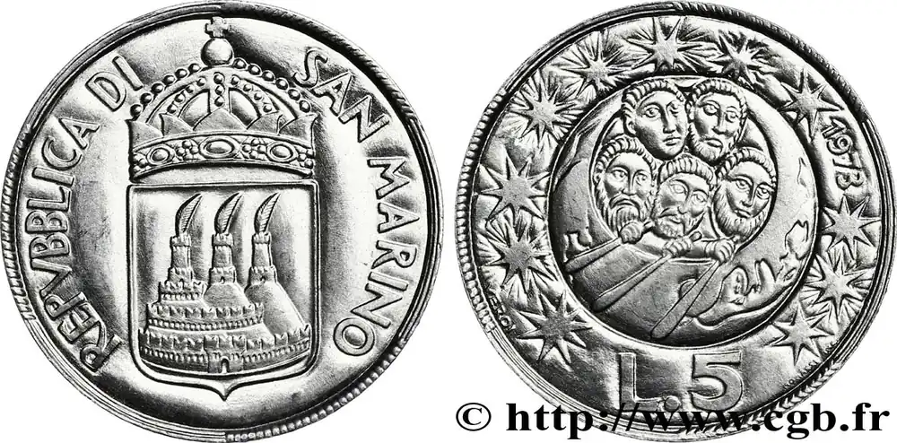 SAINT-MARIN 5 Lire armes / 5 hommes sur une barque 1973 Rome – R fwo_891793 Monde Prix Bas