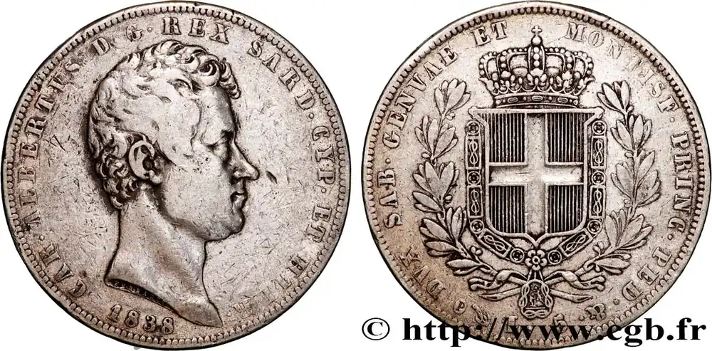 ITALIE – ROYAUME DE SARDAIGNE – CHARLES-ALBERT 5 Lire Charles Albert 1838 Gênes fwo_864470 Monde En Vogue
