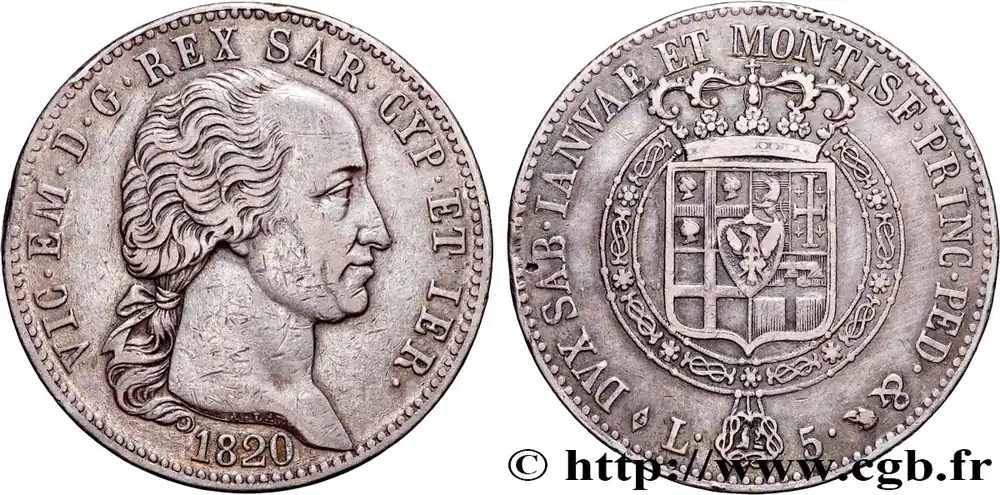 Bon Plan ITALIE – ROYAUME DE SARDAIGNE – VICTOR-EMMANUEL Ier 5 Lire 1820 Turin fwo_882249 Monde