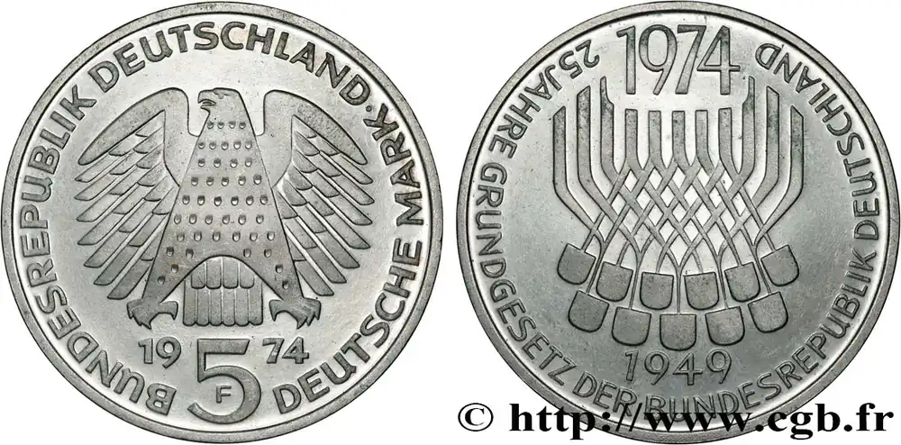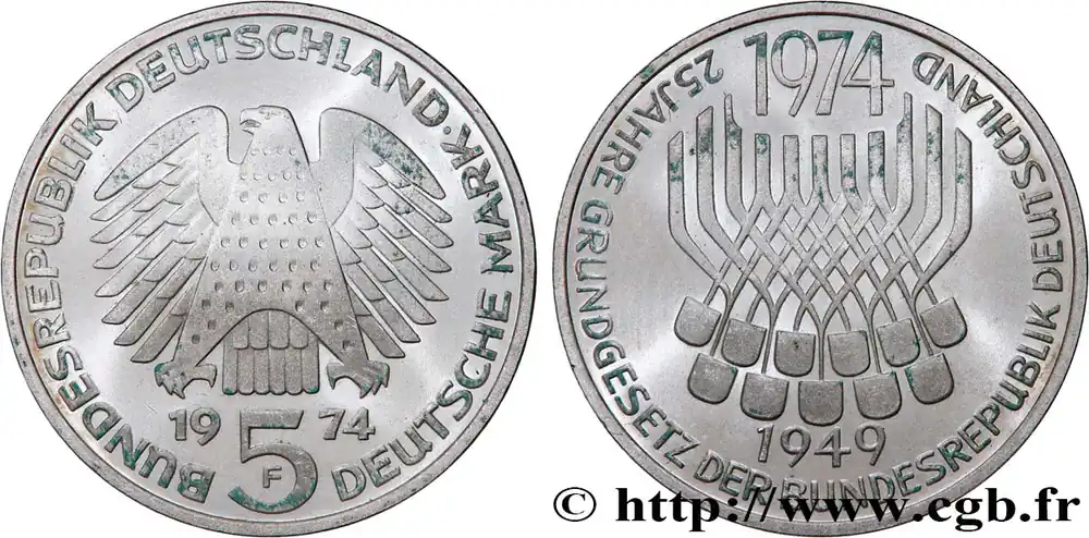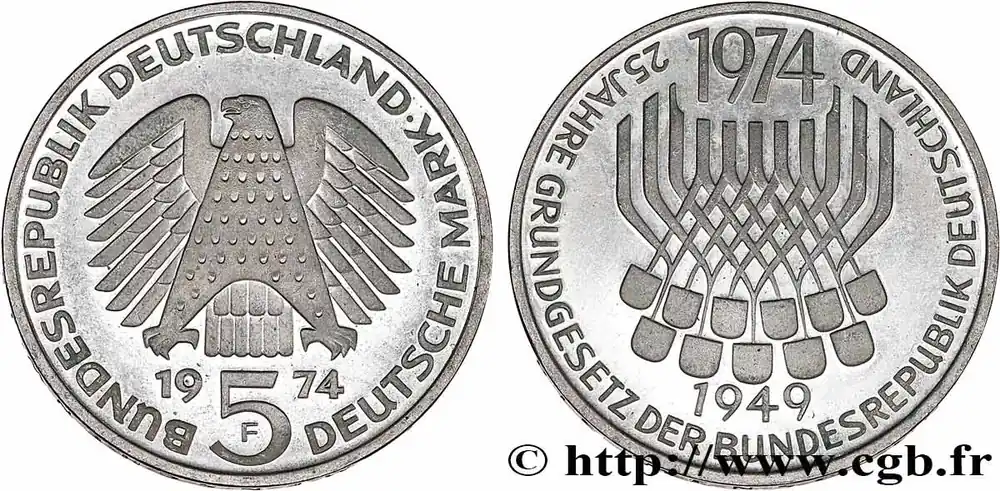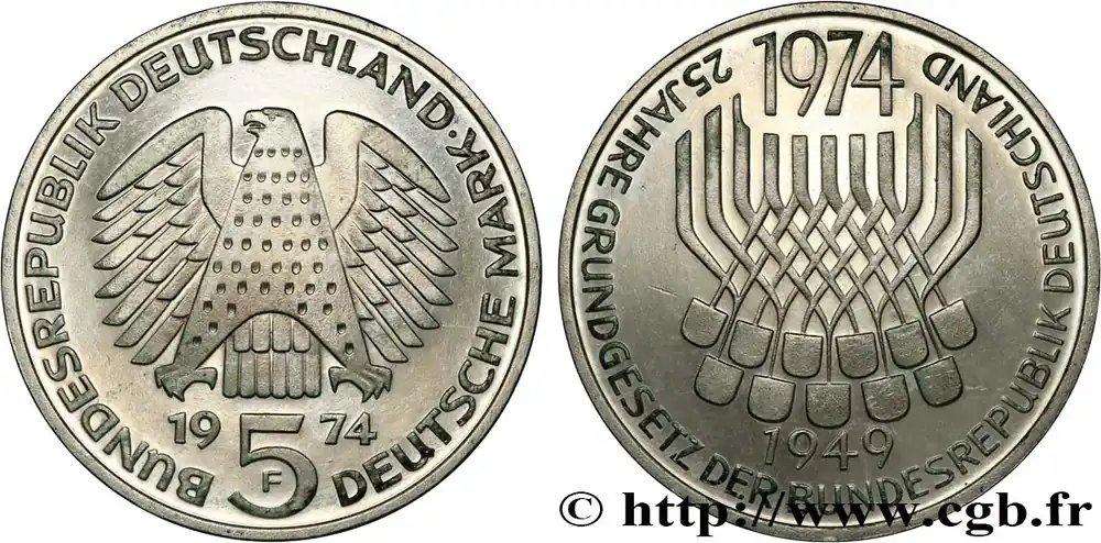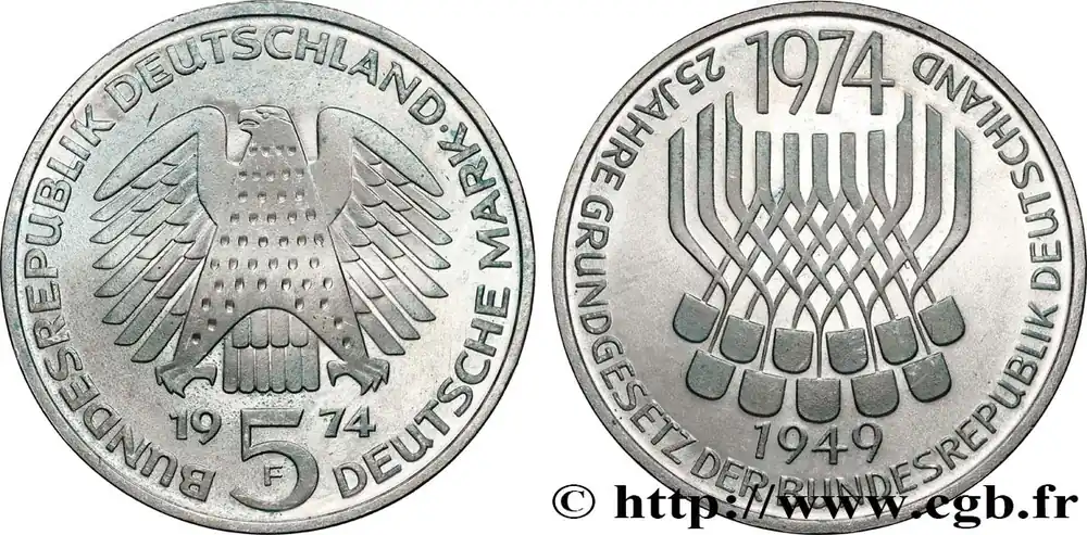 Tendance ALLEMAGNE 5 Mark Proof 25e anniversaire de la République Fédérale 1974 Stuttgart fwo_822919 Monde