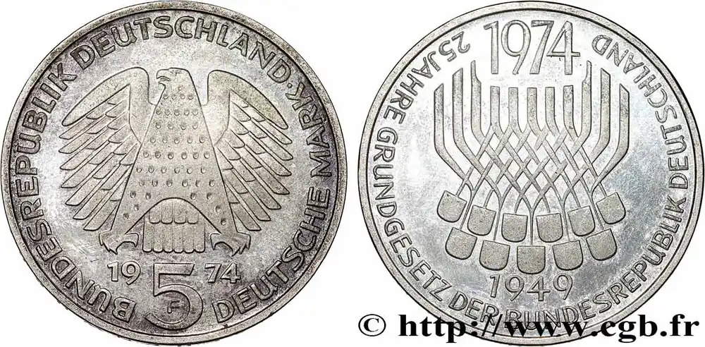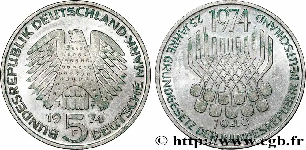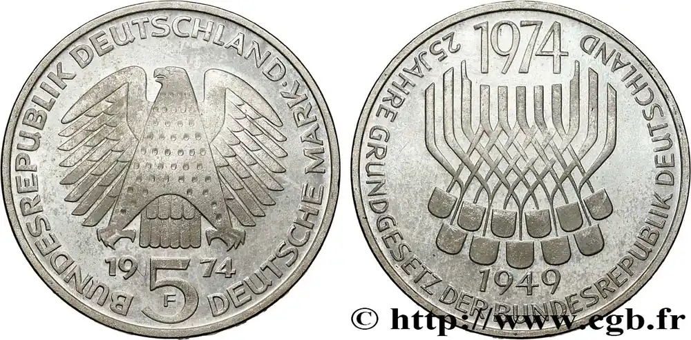 Remise ALLEMAGNE 5 Mark Proof 25e anniversaire de la République Fédérale 1974 Stuttgart fwo_784265 Monde