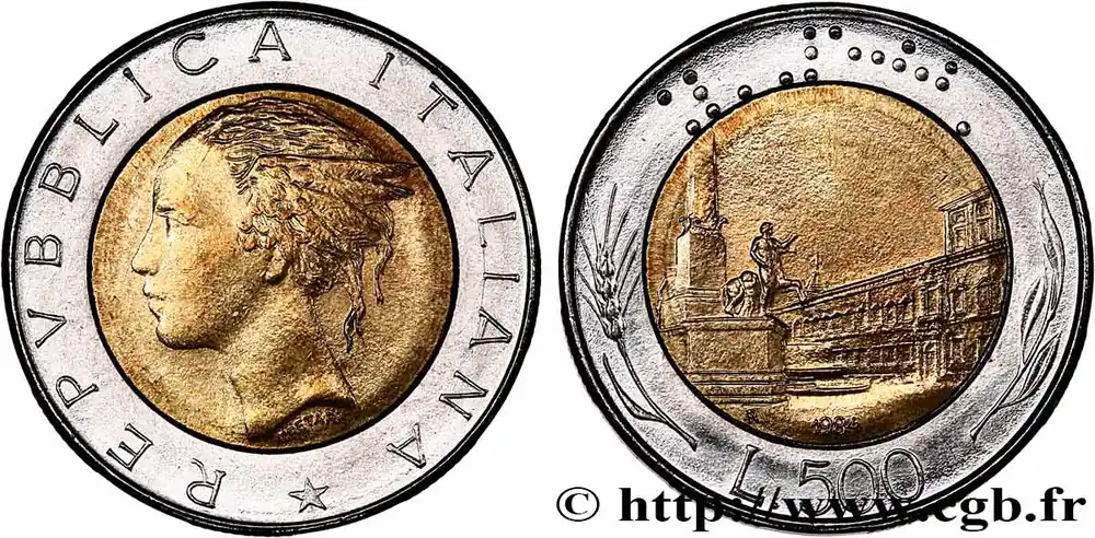 500 Lire tête de femme représentant la République / Place et Palais du Quirinal à Rome