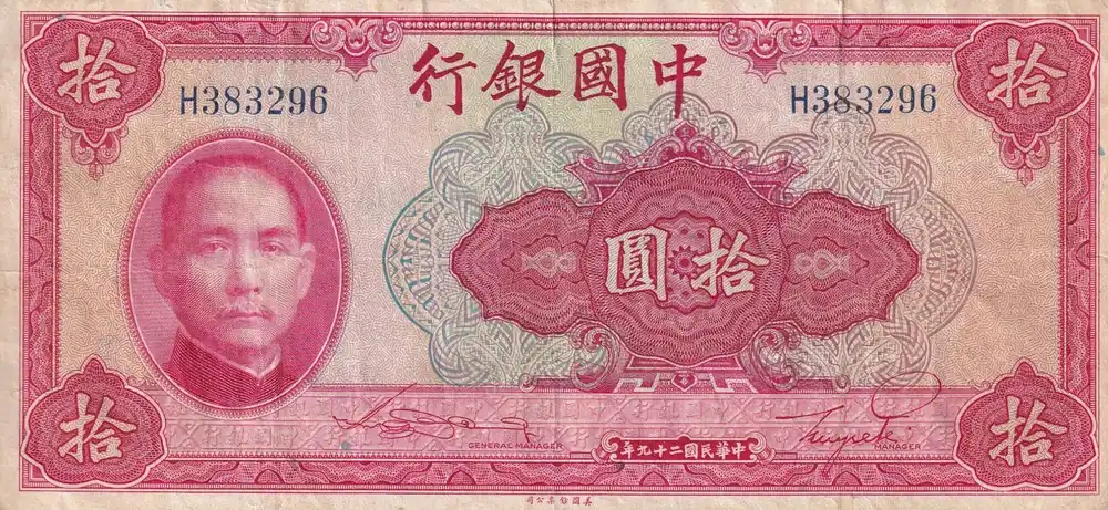 Top Qualité Billet Chine 10 Yuan – SYS – 1940 – Série H – P.85b