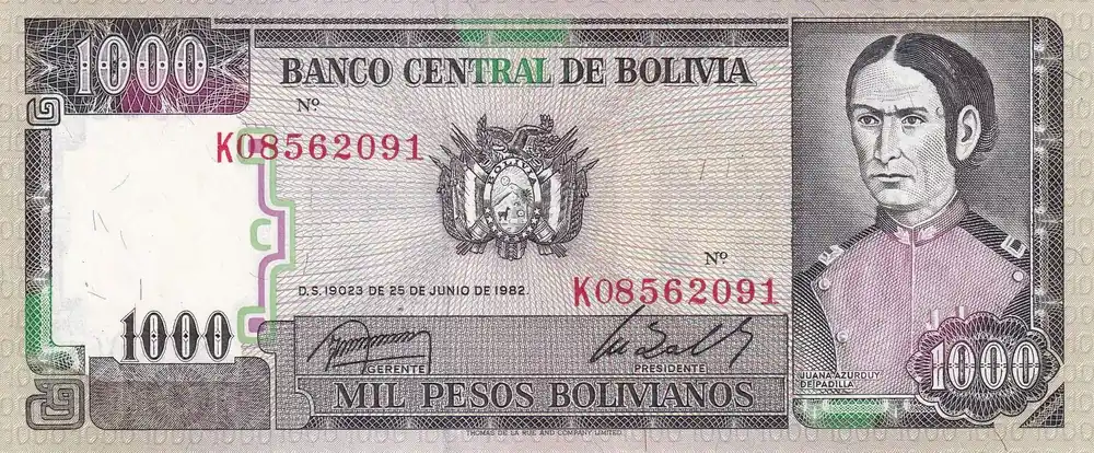 Top Qualité Billet Bolivie 1000 Pesos Bolivianos – Juana De Padilla – Maison de la liberté – 1982 – Série K – P.167