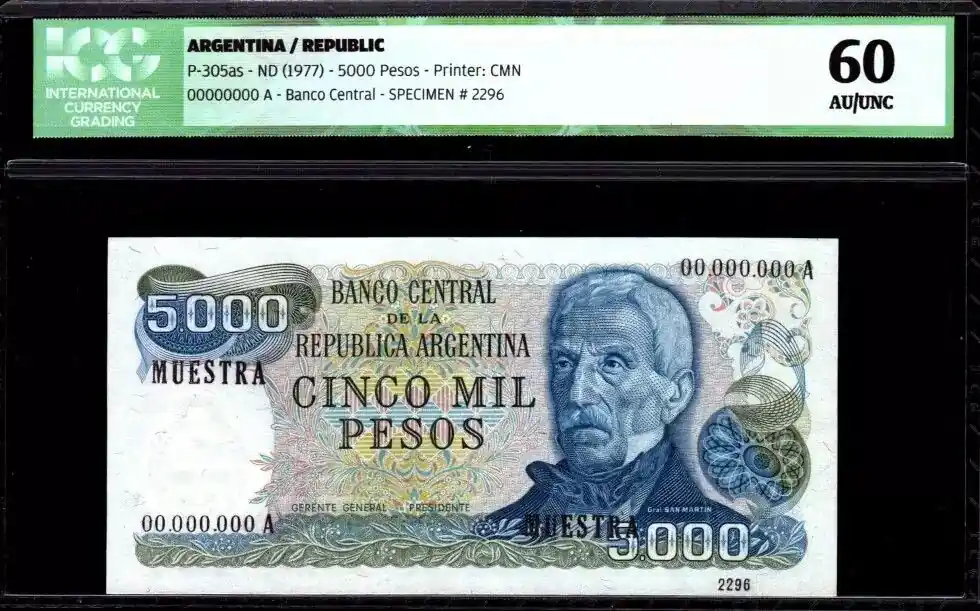 Top Qualité Billet Argentine 5000 Pesos J. San Martin – Specimen – 1977 – ICG AU/UNC60 – P.305as