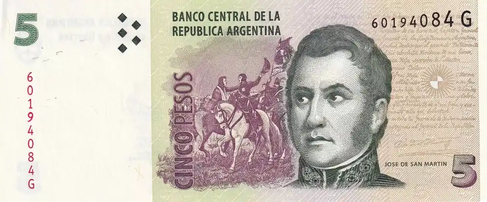 Top Vente Billet Argentine 5 Pesos – J. San Martin – Monument – ND (1996-2003) – Série G – P.347