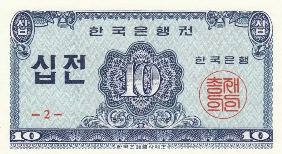 Billet Corée du Sud 10 Jeon Bleu – 1962 Fait Main