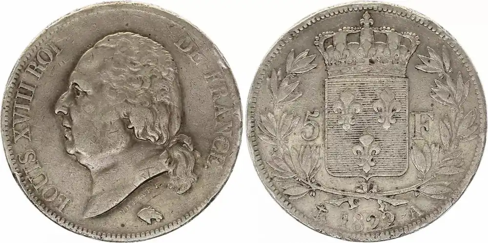 5 Francs Louis XVIII buste nu – 1822 A Paris – Argent Prix Bas