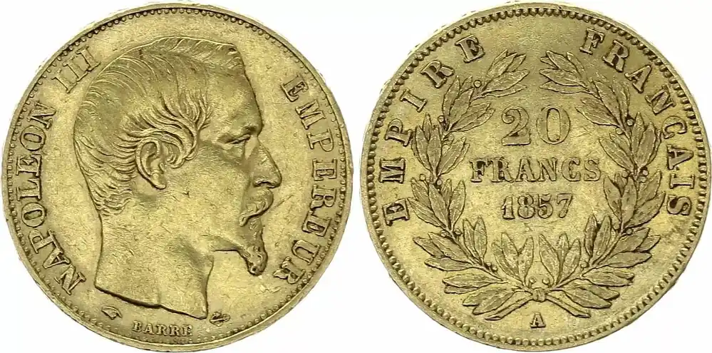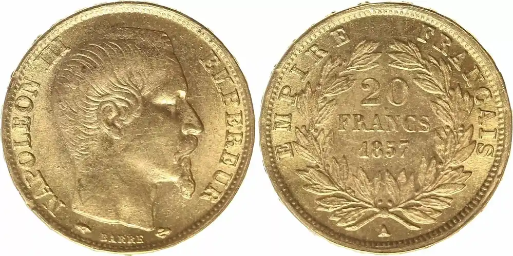 France 20 Francs Napoleon III Tete nue – 1857 A Paris – Or Artisanat