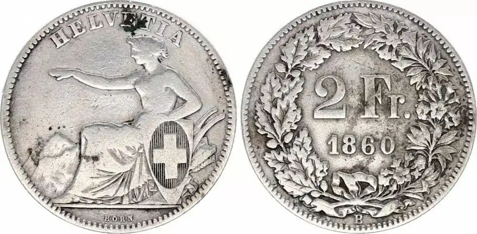 Suisse 2 Francs Helvetia – 1860 B Berne Seulement Aujourd’hui
