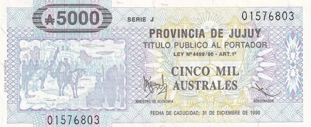 Artisanat Billet Argentine 5000 Australes – Province de Jujuy – 1990 – Série J – P.S2412