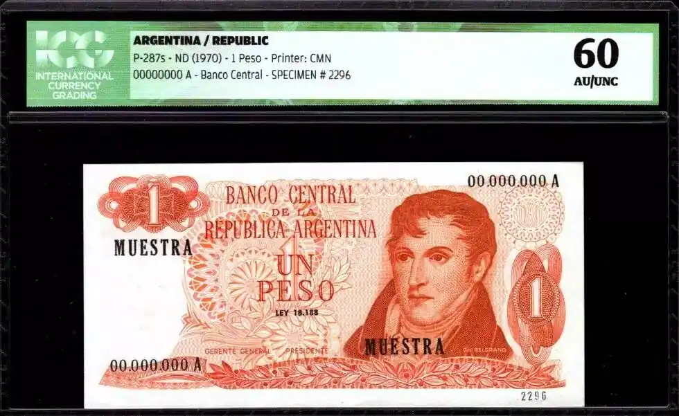 Billet Argentine 1 Peso M. Belgrano – Spécimen – 1970 – ICG AU/UNC60 – P.287s Prix Réduit