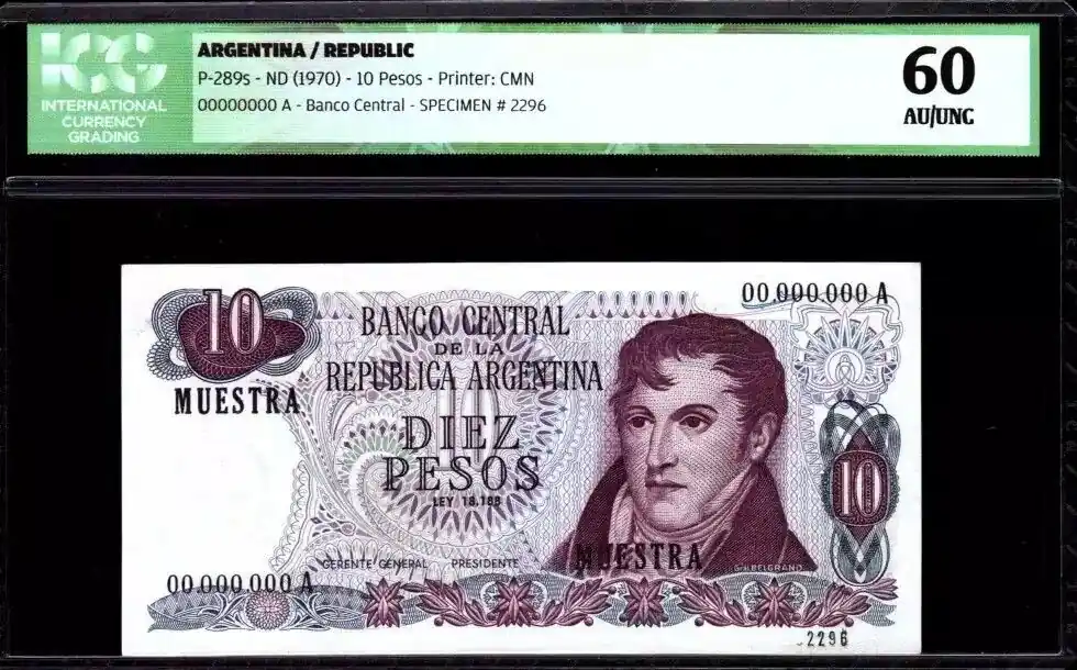 Billet Argentine 10 Pesos M. Belgrano – Spécimen – 1970 – ICG AU/UNC60 – P.289s Petit Prix