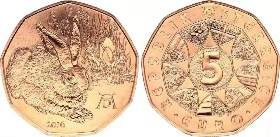Autriche 5 Euro, Jeune Lièvre de Durer – 2016 Prix Réduit