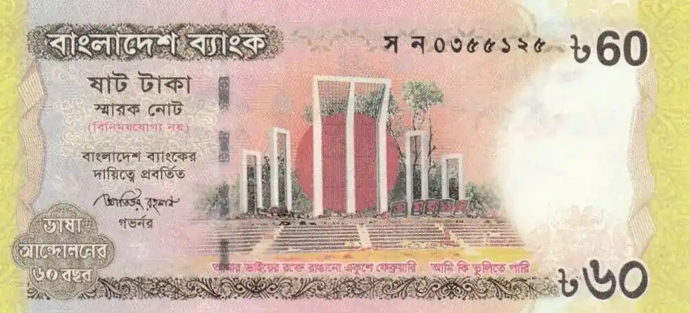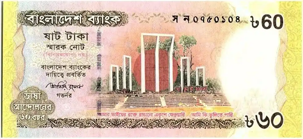 Billet Bangladesh 60 Taka Monument – 1952-2012 language movement Édition Limitée