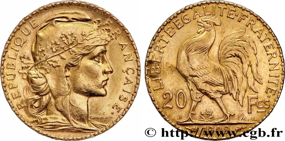 20 francs or Coq, Liberté Égalité Fraternité 1909 Paris F.535/3 fmd_605888 Modernes Vente Flash