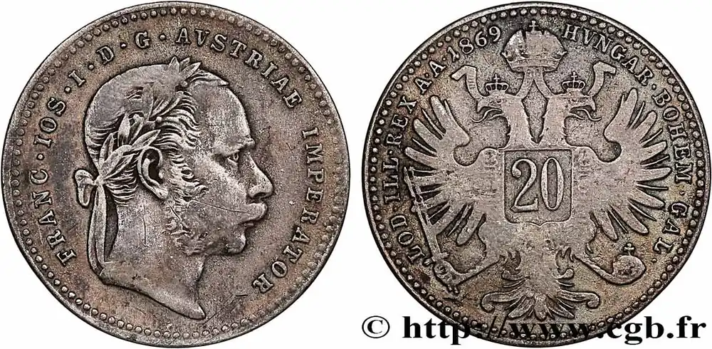 Affaire À Saisir AUTRICHE 20 Kreuzer Empereur François-Joseph Ier tête laurée / aigle bicéphale 1869 Vienne fwo_748325 Monde