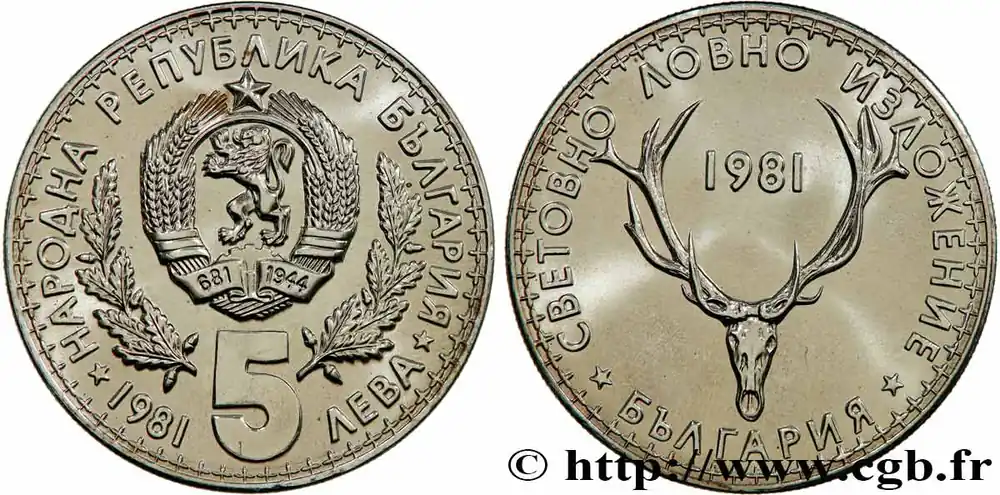 Achetez Aujourd’hui BULGARIE 5 Leva exposition internationale de la chasse, emblème national / tête de cerf 1981 Sofia fwo_748335 Monde