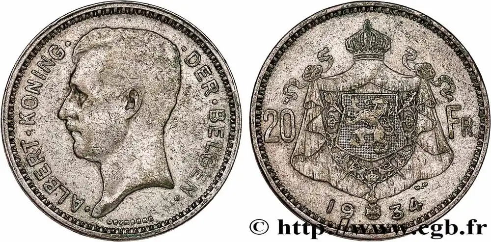 BELGIQUE 20 Franken (Francs) Albert Ier légende Flamande 1934 fwo_750199 Monde Prix Cassé