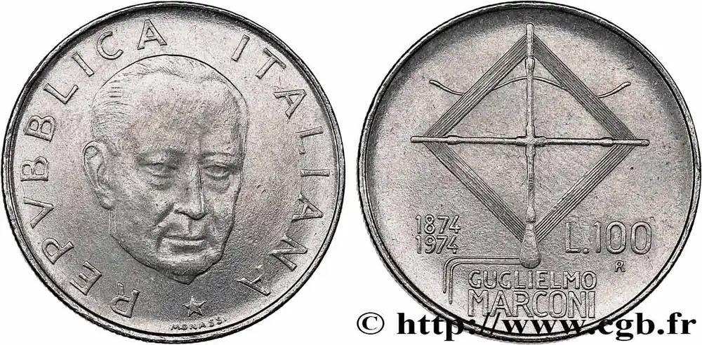 Achat Immédiat ITALIE 100 Lire 100e anniversaire de la naissance de Guglielmo Marconi 1974 Rome – R fwo_747598 Monde