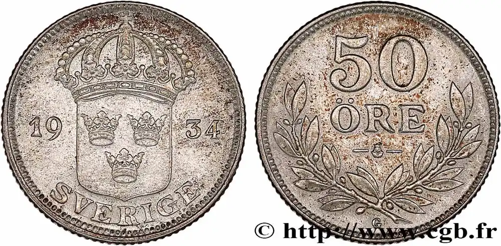 SUÈDE 50 Ore écu couronné 1934 fwo_776008 Monde Artisanat