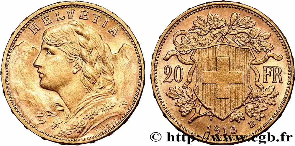 OR, PALLADIUM ET PLATINE INVESTISSEMENT 20 Francs « Vreneli » 1915 Berne fwo_783845 Monde Super Prix