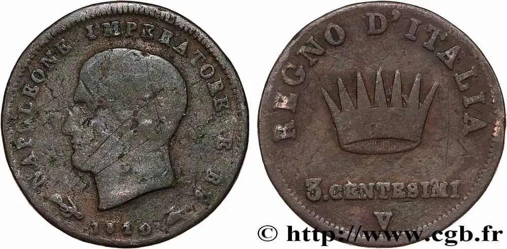 ITALIE – ROYAUME D’ITALIE – NAPOLÉON Ier 3 Centesimi Napoléon Ier roi d’Italie 1810 Venise fwo_781303 Monde Expédition Rapide