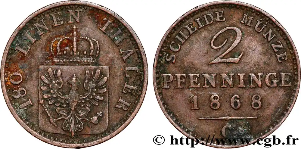 ALLEMAGNE – PRUSSE 2 Pfenninge Royaume de Prusse 1868 Francfort – C fwo_789618 Monde Nouvel Arrivage