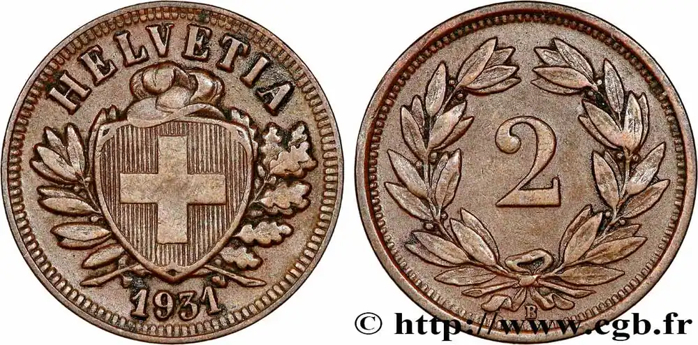 SUISSE 2 Centimes (Rappen) croix suisse 1931 Berne – B fwo_782148 Monde Top Qualité