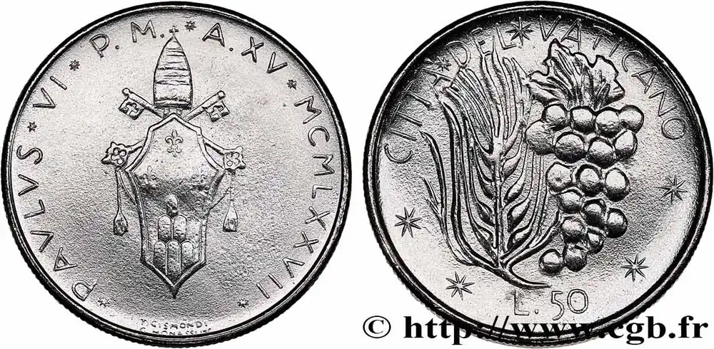 VATICAN ET ÉTATS PONTIFICAUX 50 Lire armes Paul VI an XV 1977 Rome fwo_775138 Monde En Vogue