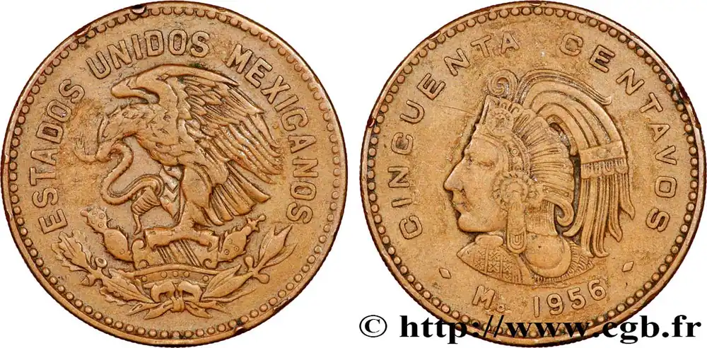 Certifié MEXIQUE 50 Centavos aigle / l’empereur Cuauhtémoc 1956 Mexico fwo_782145 Monde